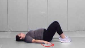 To perform without a ball: lay flat on your back with your knees bent and feet on the floor. Next, gently press your low back into the floor as you tuck your tailbone off the ground then relax and return to the start position. **Remember not to spend too much time on your back once you are in the second trimester. Rest on your side or in the seated position between sets! If it’s too much to lay flat on your back, you can do these while leaning with your back against a wall.
