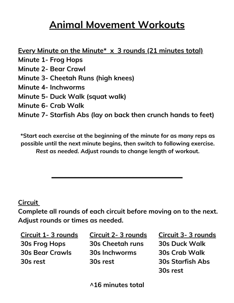 This is a great option if you have little ones that you want to get involed. Create a workout that uses “animal movements” and keep kids engaged while they have freedom to be silly. I went ahead and made an animal workout for you, find it down below!